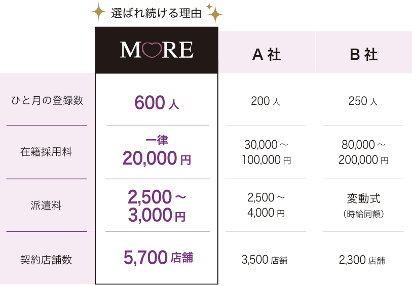 在籍採用料は2万円のみです。在籍後はモアにお支払い頂く料金は一切ございません。